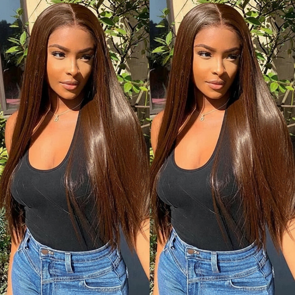 Cette perruque 4x4 marron chocolat avec fermeture en dentelle transparente sans colle offre une ligne de cheveux naturelle et une pose facile sans colle. Fabriquée en cheveux humains de première qualité, elle offre une texture lisse qui s'harmonise parfaitement pour un fini impeccable. La dentelle transparente offre une grande polyvalence, permettant diverses options de coiffure tout en garantissant confort et durabilité. Idéale pour un look professionnel et soigné en un minimum d'effort.